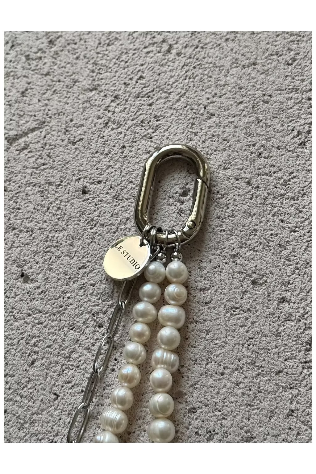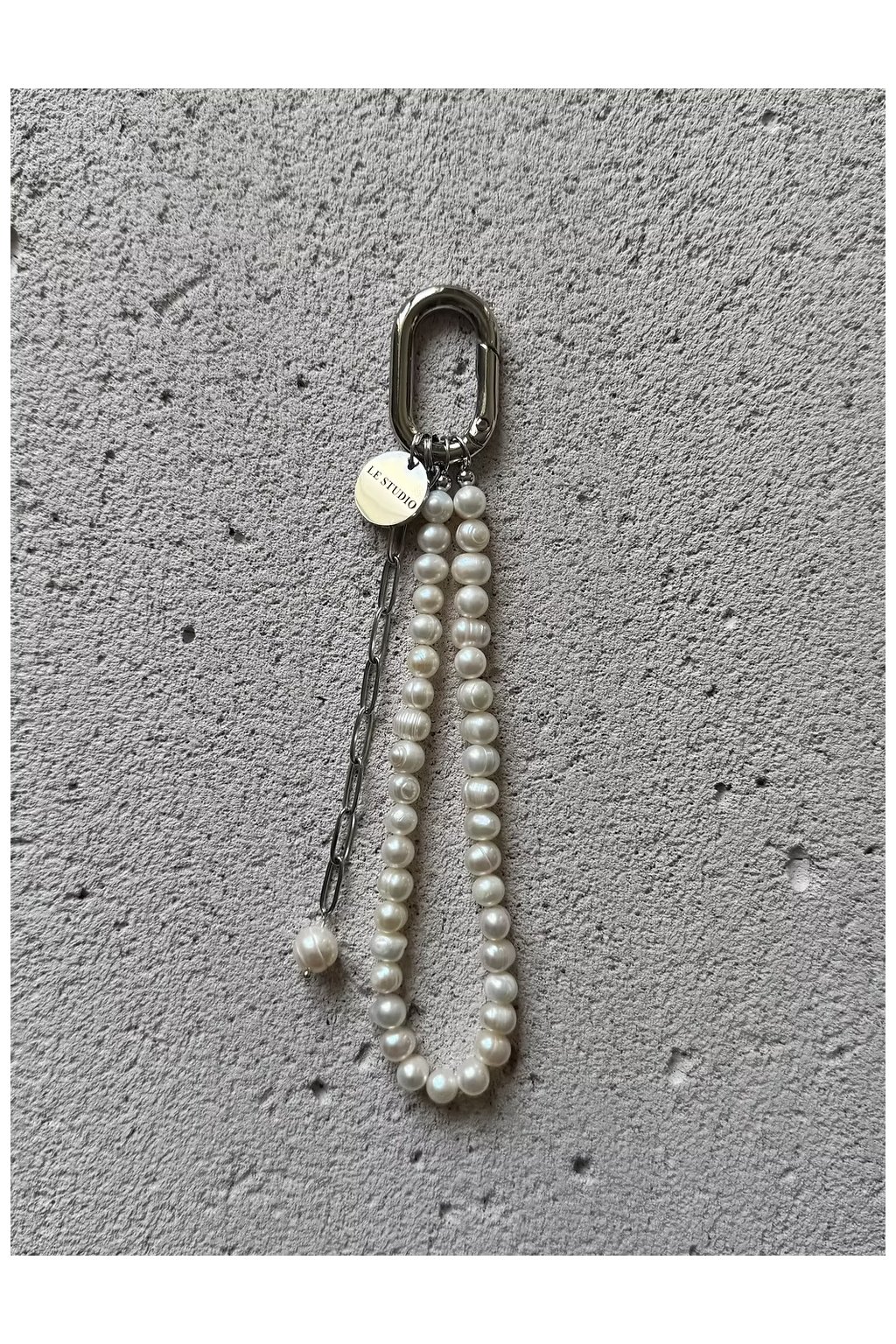 Tento ručně vyráběný přívěsek na kabelku zdobí říční perly doplněné kvalitními kovovými komponenty ve stříbrném nebo zlatém provedení.