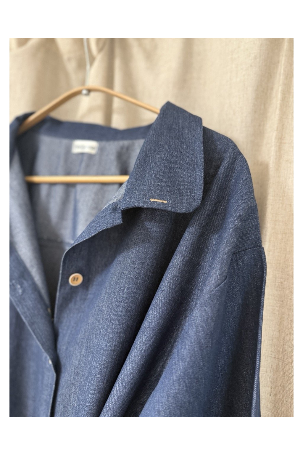 Jsou ušité z recyklované bavlny. Dlouhý rukáv do gumičky, propínací, takže užijete i jako lehký kabátek a můžete je přepásat páskem ať už zapnuté nebo jen volně chycené. S vysokými rozparky, které samozřjemě můžeme na vaše přání zmenšit. Opět velké množství možností jak je stylovat.