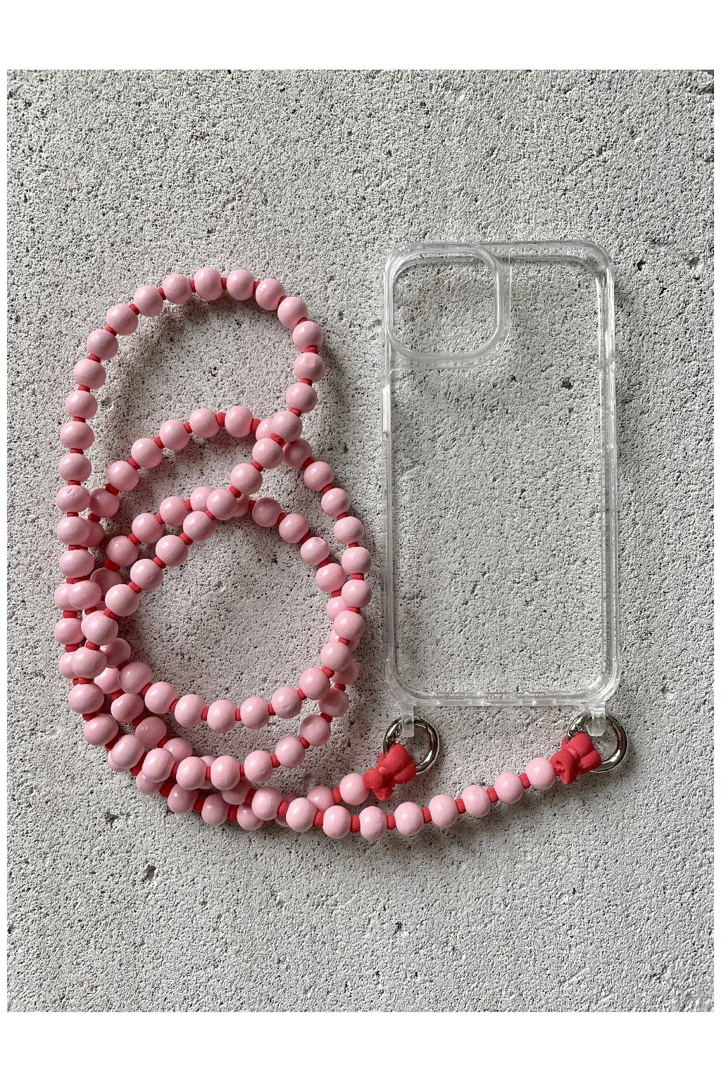 Ručně vyráběný popruh na telefon z baby růžových dřevěných korálků a červeného popruhu, s kvalitními kovovými karabinami pro snadné připnutí.
