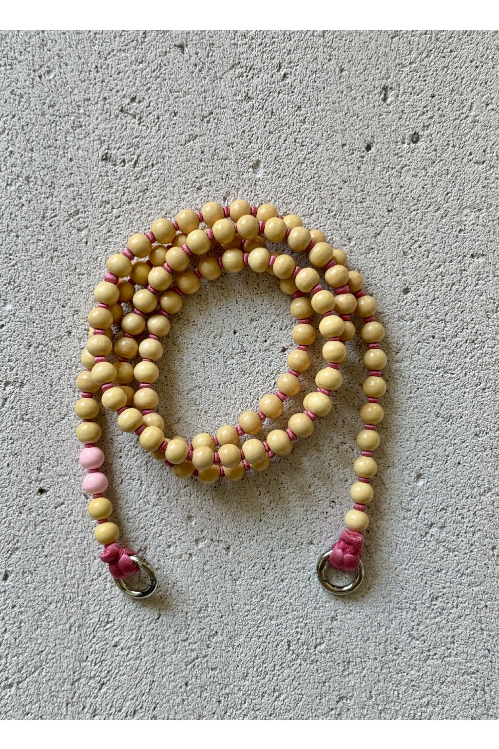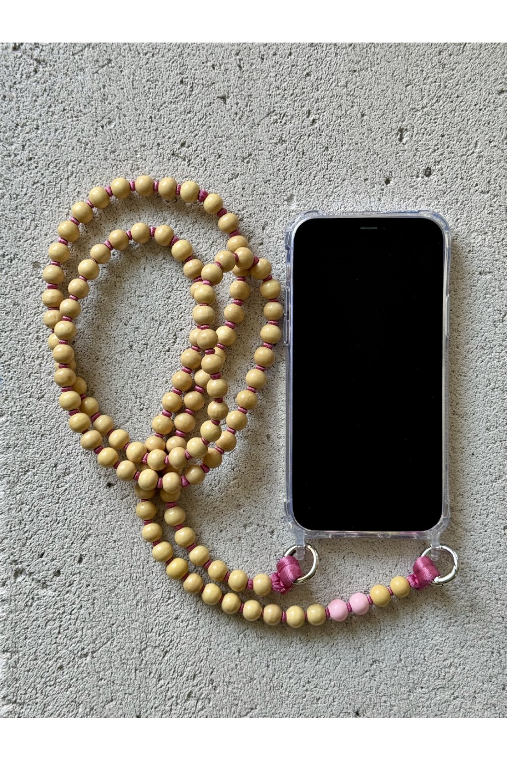 Ručně vyráběný strap na telefon z přírodních dřevěných korálků a růžového popruhu, doplněný o kvalitní kovové karabiny pro snadné připnutí.