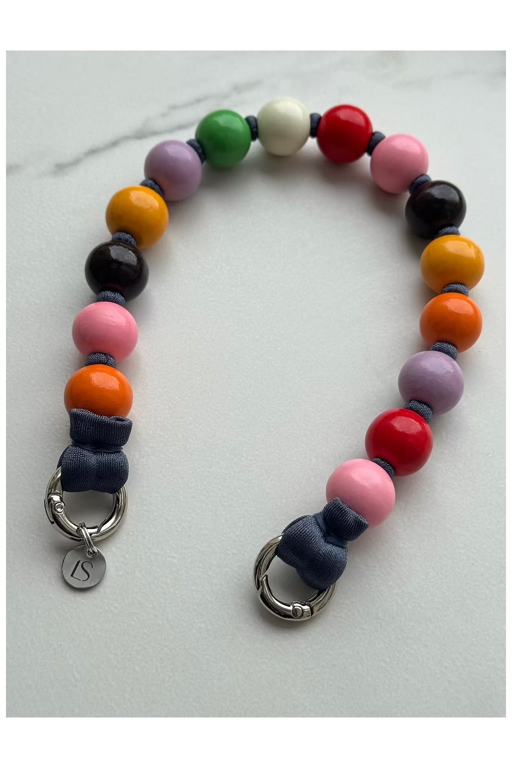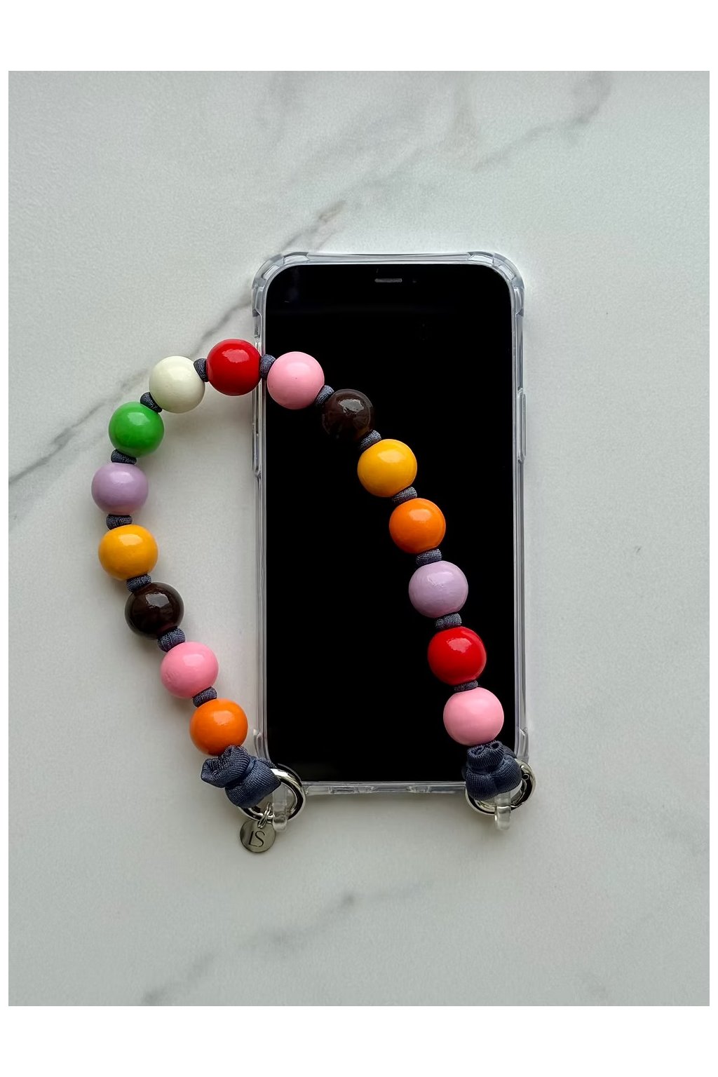 Phone strap ručně vyrobený z barevných dřevěných korálků na šedé šňůrce, doplněný kvalitními kovovými karabinami pro snadné připnutí.