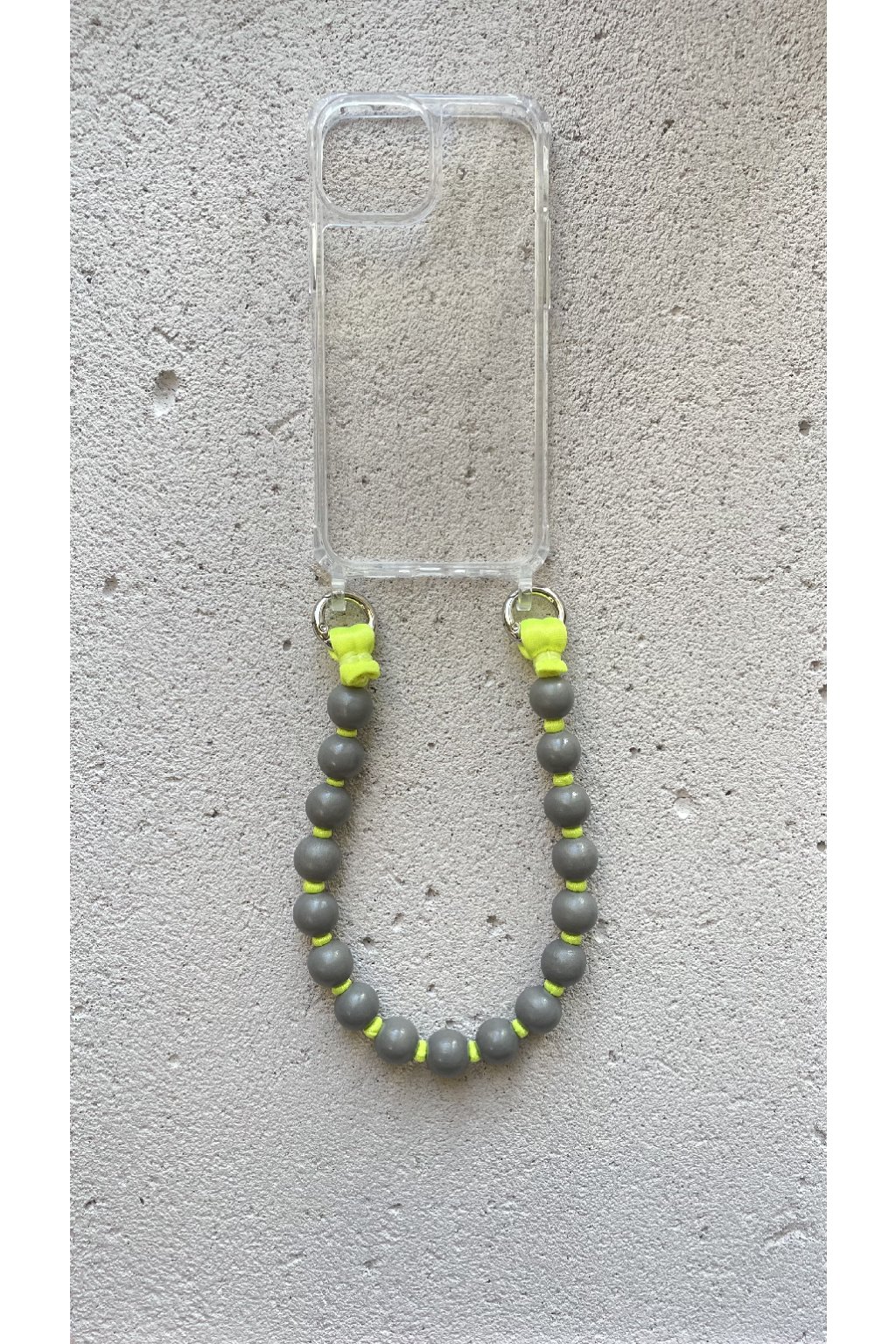 Phone strap ručně vyrobený z šedých dřevěných korálků a žlutého popruhu, doplněný kvalitními kovovými karabinami pro snadné připnutí.